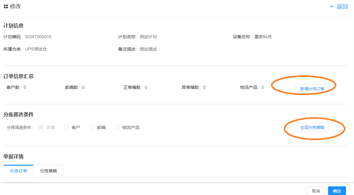 分拣计划,三个步骤完成一个分拣计划。 第一步:分拣计划新增  点击新增按钮,填写计划信息  然后点击确定完成。 第二步:分拣计划生效 计划新增完成后,点击生效按钮  选择设备  点击确定按钮,分拣计划添加分拣设备完成。  第三步:设置分拣策略 点击设置分拣策略按钮  弹出分拣策略配置页面  接着加入分拣订单及分拣格口分配 加入分拣订单 点击新增分拣订单,弹出选择订单页面  选择入库订单后,点击确定按钮,新增分拣订单完成。  分拣格口配置 上图中,点击生成分拣策略,生成结果如下图  根据结果生成,填写格口号后,点击确定,设置完成。