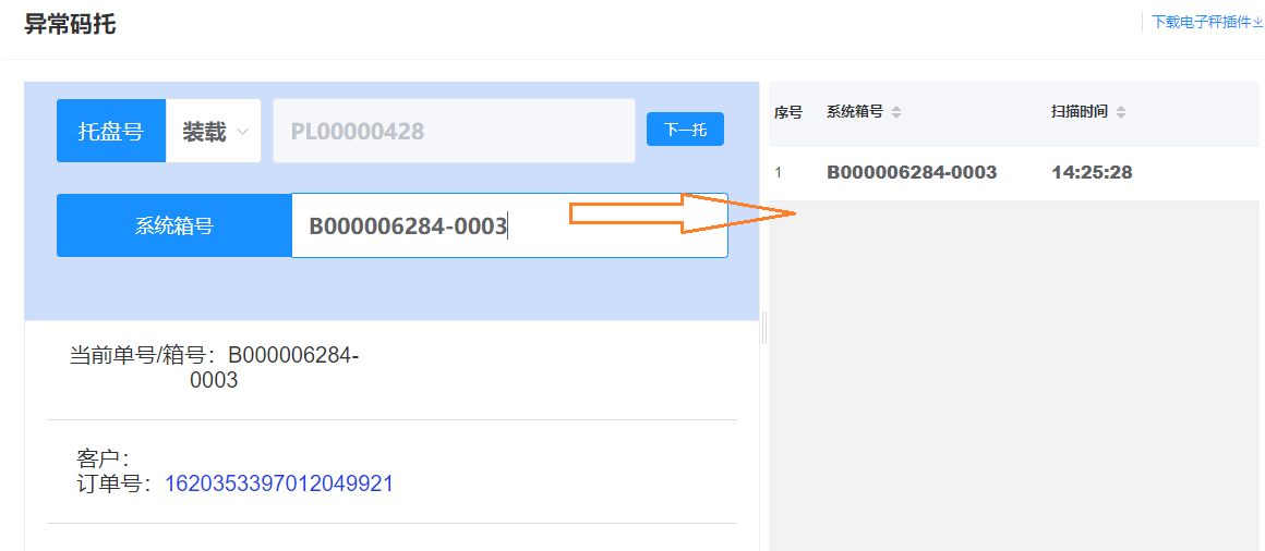转运异常单处理结果为上架存储的异常箱,在这里进行码托操作。 上架存储的异常箱操作流程: 转运异常箱异常处理为为上架存储 --> 异常打托 --> 异常上架-->审核转运异常单 产生该箱的库存流水后,通过备货出库订单,进行备货出库操作。 异常码托  扫入或输入系统箱号后回车,转运异常箱码托完成。继续操作其他需上架存在转运异常箱,装入托盘。 点击下一托,本托操作完成。