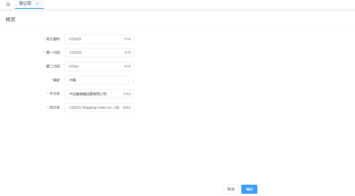 船公司列表,点击新增按钮  填写船公司信息  点击确定按钮后保存,也可以选择导入模式,进行船公司记录导入。 船公司资料,会被海运订舱单引用,必填字段。