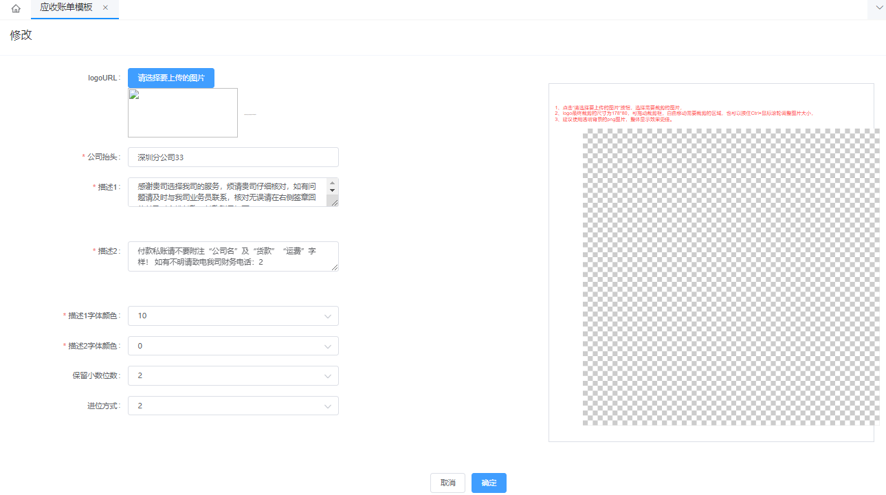 应收账单模板,维护应收对账单生成的模板,根据公司要求更改应收对账单信息 点击应收对账模板  点击编辑汇总页信息  上传logo,修改抬头及描述后确定,保存完成。 点击编辑明细表头  增加或删除费用明细页的表头,修改表头名称,确定后保存完成。 应收对账单 - 生成对账单,引用应收账单模板导出生成对账单文件。