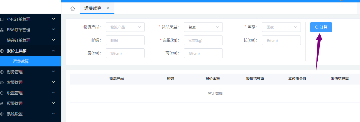 运费试算用于试算包裹的运费跟时效,根据对比选择相应的物流产品下单,如下图: