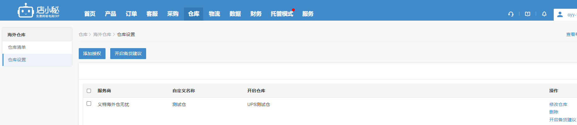 仓库授权 ERP登录后,选择第三方仓库:海外仓库  仓库设置,点击添加授权  添加授权信息后,确定  仓库收取成功  仓库清单列表,点击同步库存  仓库物流 海外仓库物流  点击启用  填写后保存,物流渠道设置完成。 订单下单备注: 创建手工订单,发货仓只会显示店小秘仓库模块的自营仓库,不会显示海外仓,不选择就行了,手工订单创建好后,处理订单时选择海外仓的物流渠道,会自动匹配这个海外仓库。