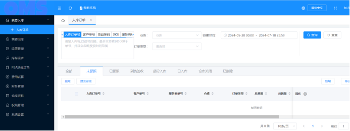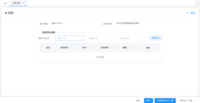 # WMS客户创建入库订单 ## ==注:创建入库订单前需完成货品维护操作!== ### 一、使用客户账号进行登录 登录网址: ### 二、进入创建入库订单界面 在左侧菜单栏点击【我要入库】  点击二级菜单---我要入库   ### 三、创建入库订单 点击【新增】按钮新增入库订单  填写入库订单信息  #### 示例填写:  填写完毕后点击【确定】或【确定并装箱】 点击【确定】会跳转到入库订单列表界面  点击【装箱】进入装箱环节  点击【确定并装箱】会直接跳转到装箱界面  填写装箱箱尺寸信息 #### 示例填写:  填写完毕后为该箱添加货品 点击【新增货品】按钮  没有货品维护会出现以下界面  维护货品后会出现货品列表,选择你想要装箱的货品  选取完毕后点击【确定】即可  确认货品后填写装箱的货品数量  #### 示例填写:  填写完成后点击【保存】即可,系统支持边打印边装箱,也可以选择打【印唛头并下一箱】,或是【保存并下一箱】 保存后会回到入库订单列表  需要先进行审核后才能【打印箱唛】  下一步勾选我们创建的入库订单,点击【提交审核】进行预报  可以查看到入库订单已预报给仓库,入库订单创建完毕