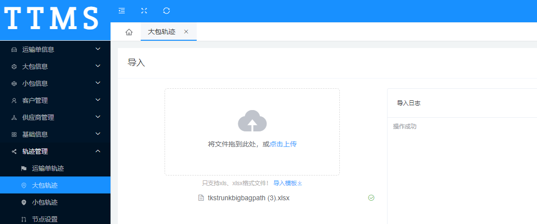 大包轨迹,系统产生的大包轨迹包括:干线揽收轨迹,出口清关完毕轨迹,也可手工添加或导入大包轨迹 大包轨迹手工新增,大包轨迹列表右方,点击【新增】  填写大包轨迹信息  填写完成后,点击确定保存  大包轨迹导入  点击导入模板,下载导入模板文件  填写导入模板文件的大包轨迹信息  导入文件后,提示成功  查看导入的轨迹记录  如果导入文件有问题,参考导入日志提示信息进行修正后再次导入。 注意:当然大包轨迹时间不能早于已推送的大包轨迹时间。 大包轨迹可直接手工推送,也可定时任务推送。