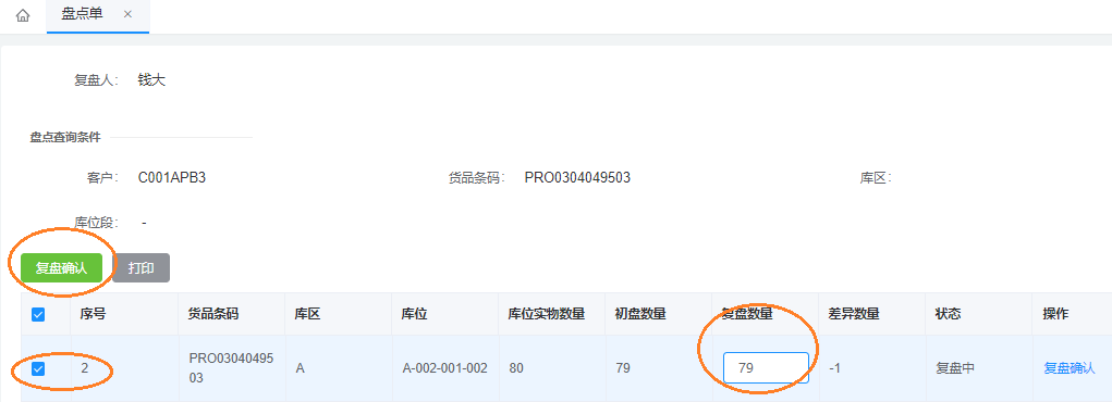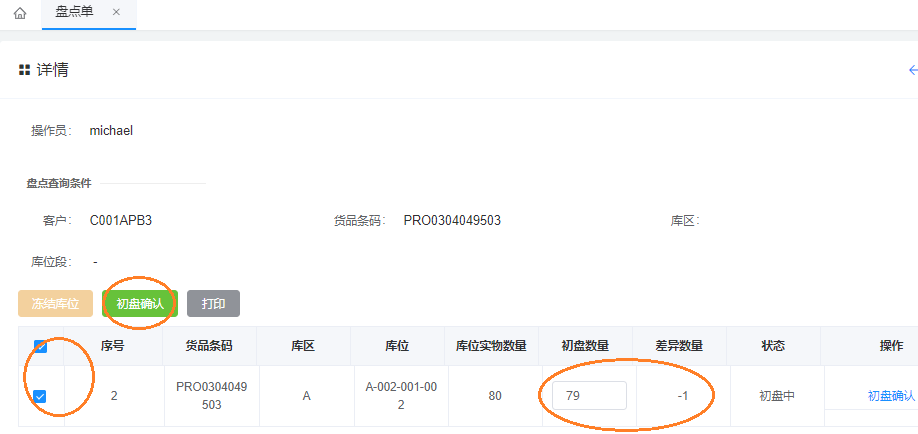 盘点单列表,点击【新增】按钮  填写盘点信息,以及需要盘点的货品信息  点击【生成盘点单】按钮,盘点记录如图  查看需要盘点的记录,如果货品不需要盘点,点击【删除】按钮  记录删除成功,点击【确定】按钮,盘点单生成  点击【开始盘点】,确认盘点开始  点击【确定】按钮,进入下一步  点击【初盘】,进入下一步  点击【冻结库存】,提示确认冻结操作  点击【确认】按钮,库存冻结(提示:冻结后的货品库存不参与波次生成)  填写初盘数量后,点击【初盘确认】,提示确认  点击【确认】按钮  如果有差异数量,需要待复盘,返回复盘单列表  点击【开始复盘】按钮,选择复盘人  点击【确定】按钮,返回盘点单列表  点击【复盘】按钮,开始复盘  填写复盘数量后,点击【复盘确认】按钮吗,复盘确认  点击【确定】按钮,复盘完成  如果线下做好了盘点操作,可选库存调整,快速调整货品库存,参阅下一节。