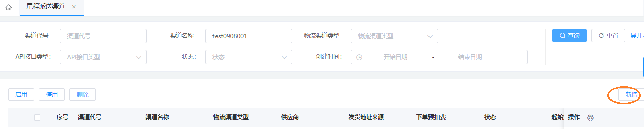 点击【新增】按钮,创建一个尾程派送渠道  填写渠道信息,如下图  点击【确定】按钮,尾程派送渠道创建成功,下一步,点击【渠道设置】,进行渠道配置。 **渠道规则**  说明: 结算重算法: 取实重,按实重计费; 取实重或者材积重最大值,实重和材重比较,取大者; 取实重或者材积重平均值,实重和材重比较,实重大,取实重;材重大,(实重+材重)除以2。 计泡条件: 查看公式说明,填写计泡条件,仅满足计泡条件后,才会计算材重,配合取实重或者材积重最大值和取实重或者材积重平均值使用。 进位规则: 进位规则是为了计费进位而设计的规则, 例如大货界定值10,大货计量单位为1,小货计量单位为0.5,意思就是10以内,以0.5进位:0.5,1,1.5...,大于10,以1进位:1,2,3... 超限规则 超限费用算法:多个超限费用产生时,可选择1、取最大值,2、取平均值,3、累加。 **运单号设置**  选择API对接,预报到的目标尾程派送渠道。 **订单校验**  如果尾程派送渠道不需要设置,预报时渠道已经校验,这个功能主要在物流产品使用。 **回邮地址**  创建渠道时,可选择发件人地址或回邮地址作为发件人地址来源;设置派送渠道的回邮地址,退件时,接受退件的地址。 **分区**  分区是渠道报价的基础,分区必填,选择分区,分区模板预先维护。 **偏远分区**  若尾程派送渠道有偏远分区,选择偏远分区,分区模板预先维护。