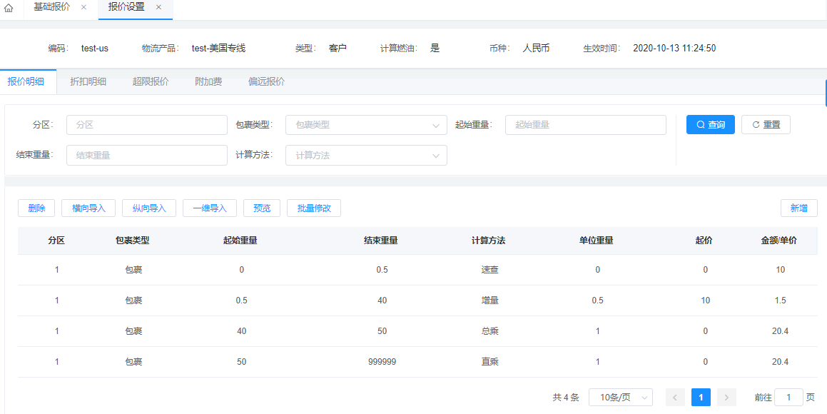 基础报价记录的操作下,点击【报价设置】  进入到报价明细列表,进行报价明细维护  点击横向导入按钮,进入报价明细导入界面  点击下载模板后,打开报价模板,如下:  包裹/0-0.5/速查:包裹重量段为0-0.5,计费方法:速查,金额/单价为10.5,那么0-0.5公斤内,都是一口价10元;若计算燃油,就是10*(1+燃油率)。 包裹/0.5-40/0.5/增量:包裹重量段为0.5-40内,采用续重计费模式 例如:1.3公斤,1.3-0.5=0.8,进位单位为0.5,0.8进位后为1,计费为10+1/0.5*1.5=13;若计算燃油,就是13*(1+燃油率)。 包裹/40-50/1/总乘:包裹重量段为40-50内,采用总乘计费模式 例如:42公斤,计费为42*20.4*(1000/1000);若计算燃油,就是42*20.4*(1000/1000)*(1+燃油率)。 包裹/50-?/直乘:包裹重量段为50以上,采用直乘计费模式 例如:100公斤,计费为100*20.4;若计算燃油,就是100*20.4*(1+燃油率)。 下载模板中,记得删除提示列。 导入模板 报价模板完成后,点击上传,开始导入报价  选择文件后,双击或确定后,开始导入报价  导入成功后,如下  如果导入报价模板里有错误,导入日志信息会提示,根据提示信息修改报价模板。 点击【返回】,查看报价导入记录  纵向导入和一维导入,报价模板的做法,可参照这个来做报价后进行导入。 删除功能,就是清空整个报价明细的记录。 批量修改:仅可修改金额/单价