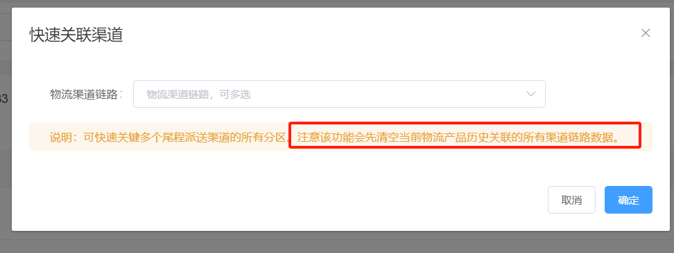 快速绑定某个产品和渠道 点击产品与渠道菜单,选择物流产品子菜单 点击渠道链路维护  点击快速关联渠道(需要确定分区一致)  注:快速关联渠道会覆盖之前的渠道链路  选择需要关联的渠道  快速绑定完成