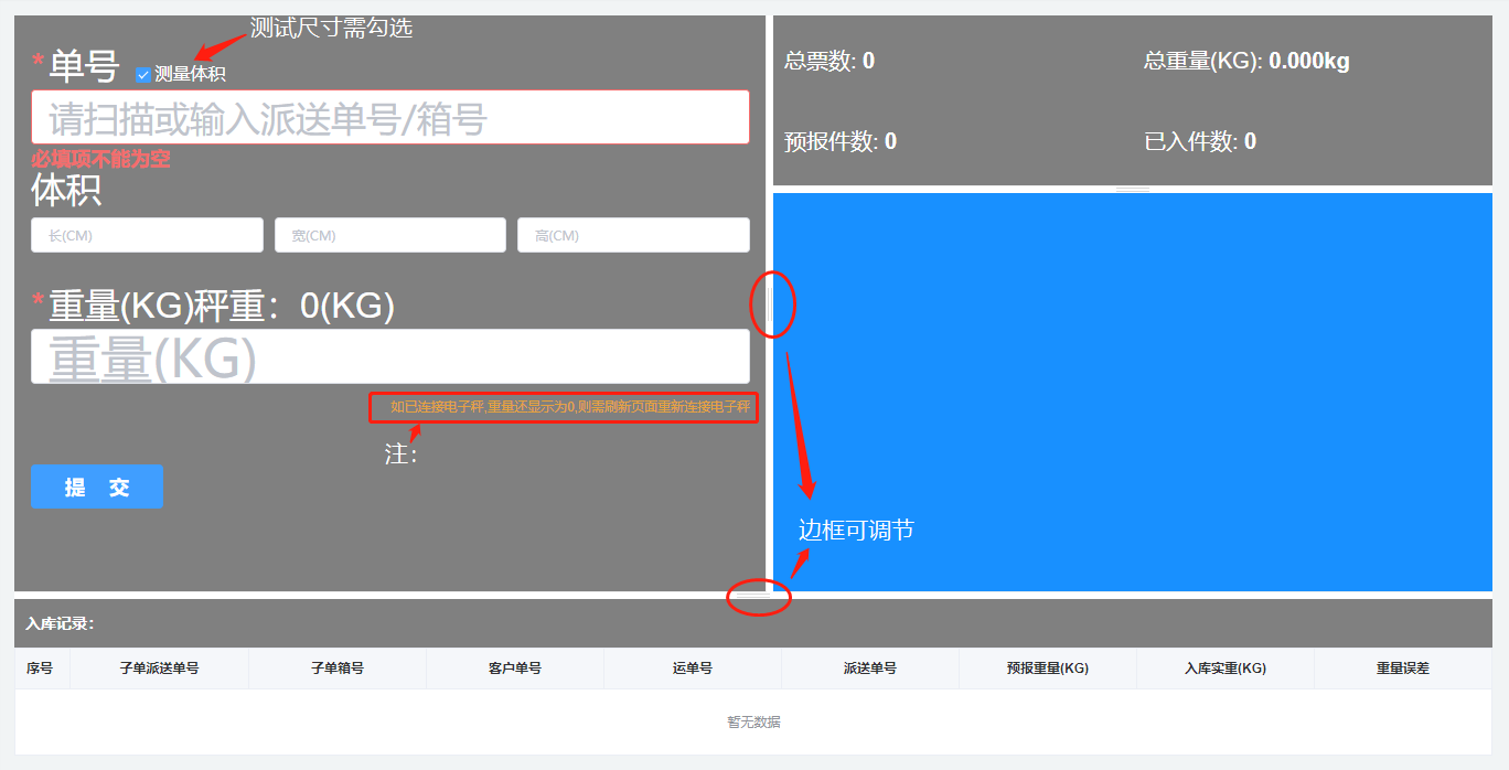 ## 简介:单件扫描入仓,一票一件 【仓库作业-入库-单件入库】,扫描或者输入运单号/派送单号/箱号,输入尺寸和重量回车,自动入仓 扫描枪和电子秤操作,需提前链接好电脑
