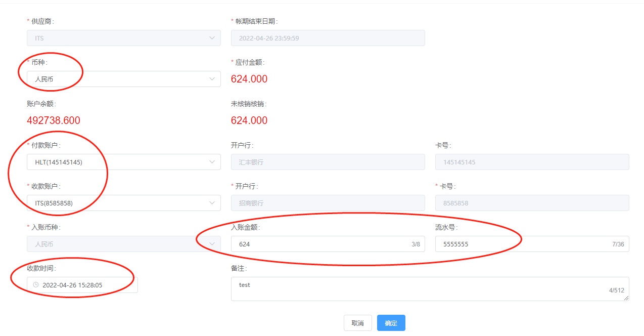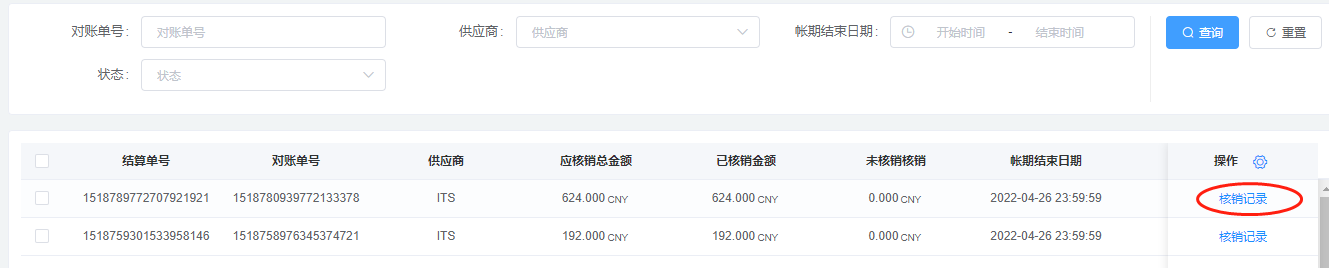 ## 简介:供应商应付付款核销单查询管理 【应付管理-应付结算单】,选中供应商核销单据,右边操作点击【核销】  选择结算币种、付款账号、收款账号、收款时间,填写实际入账金额(付款金额),流水号,点击【确定】,付款核销完成  查询界面右边操作,点击【核销记录】,可查看核销明细记录