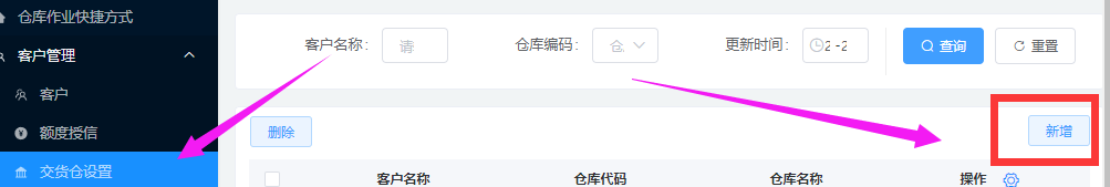交货仓设置是设置客户指定仓库送货,一旦设置这个客户的货只能这个仓库操作,其中仓库编码在**基础管理**----**仓库**中新增