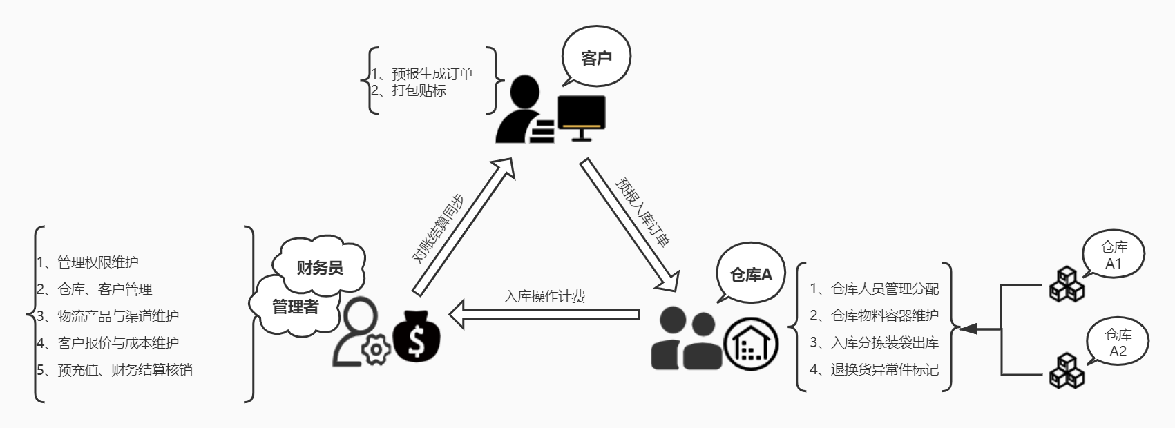 ## 不同部门定义成不同的角色,根据实际情况,对部门进行角色权限分配管理。 ## 创建用户时,指定到目标部门角色,该用户仅拥有目标部门角色的权限。 ## 公司管理员可维护仓库管理员信息,也可以维护公司管理员用户、财务结算用户等。