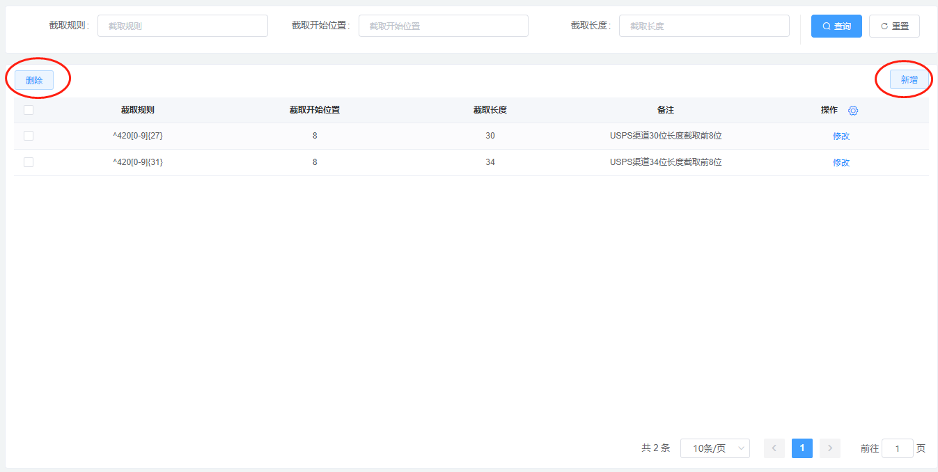 ## 简介:针对特殊隐藏派送做入库扫描截取 1、【模板与规则-运单号截取规则】,点击【新增】按钮,填入截取规则,截取开始位置、截取长度、备注,点击【确定】后保存该信息,可删除 ==注:可联系系统方客服提供技术支持==