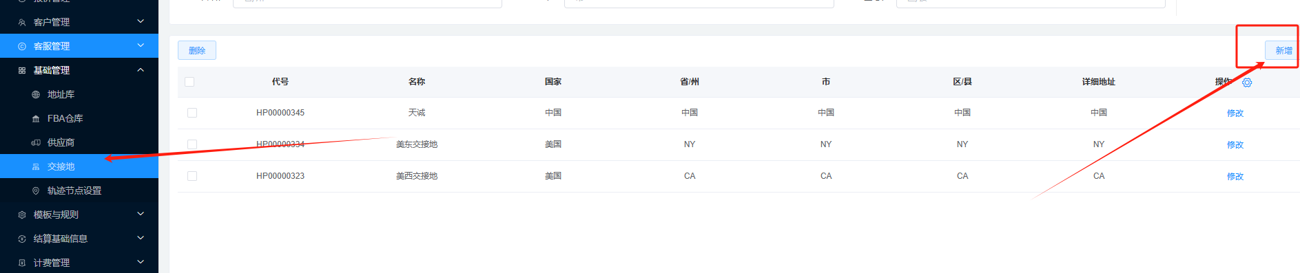 交接地是记录物流公司跟供应商代理交接包裹的地址,如下图点击新增按钮:  填写具体的地址信息,点击确定即可