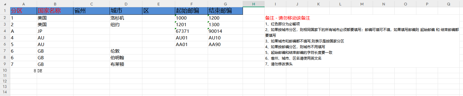 ## 简介:分区模板是用于维护产品与渠道的国家分区,可按国家、邮编、城市、FBA仓库维护分区,用于统一管理分区功能。 ### **1、单个国家分区,可点击【快速添加分区模板】**  选择对应的国家点击确定,一个国家对应一个分区模板,如下图所示:  新增后所示:  ### **2、多个国家、邮编、城市分区方式,先点击【新增】**  填写分区模板名称,选择普通或者偏远类型  点击【确认】按钮,创建分区模板,下一步点击【操作-分区明细维护】  分区模板明细维护里,可手工新增分区,也可以根据业务需求选择模板进行导入  #### 2.1新增分区,点击【新增】按钮,手工维护分区  点击【确定】按钮,一个分区创建完成,重复操作继续添加多个分区 提示:国家,例如选择美国,输入 US 或美国后,选中即可 #### 2.2城市邮编模板导入,点击【城市邮编导入】-点击【导入模板】  下载导入模板文件到本地,打开模板文件 模板示例:  根据模板填写需要的城市邮编具体信息后,保存模板再点击上传  文件导入后,提示信息如下  如果导入文件里有问题,导入日志信息会提示错误信息,根据错误信息修改导入文件即可 #### 2.3单列邮编模板导入,点击【单列邮编导入】-点击【导入模板】  模板示例:  根据模板填写需要的国家邮编具体信息后,保存模板再点击上传  文件导入后,提示信息如下  如果导入文件里有问题,导入日志信息会提示错误信息,根据错误信息修改导入文件即可 ### 2.4单列国家导入,点击【单列国家导入】-点击【导入模板】  模板示例:  根据模板填写国家后,保存模板再点击上传  文件导入后,提示信息如下  备注:如需修改分区信息,重新导入模板即可**