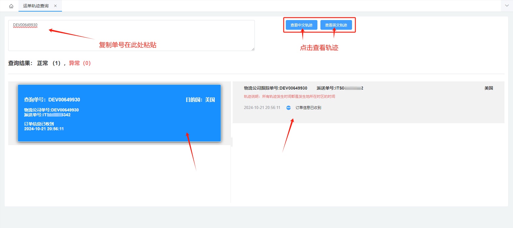 ## 运单轨迹查询是查询运单包裹的时效,可以查询中文轨迹和英文轨迹 **如图所示:**