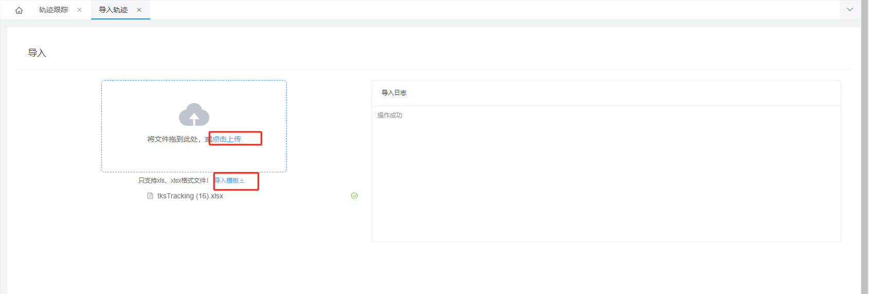## 轨迹跟踪用于查询运单轨迹 **1.在查询页面输入单号,点击查询可查看该订单轨迹跟踪情况**  **在查询页面点击查看,可查看该订单详细轨迹记录**   **2.批量添加/删除轨迹** ①批量添加:批量添加轨迹 在查询页面-搜索对应订单-勾选-点击批量添加  如下图,选择要添加的轨迹节点段、轨迹内容、轨迹发生时间、轨迹发生地(可不填),填写完点击确认即可  ②批量删除:批量删除轨迹 在查询页面-搜索对应订单-勾选-点击批量删除  如下图,选择要删除的轨迹节点段和轨迹内容,点击确定即可  **3.导入轨迹** 点击**导入**进去-下载模版   在表格录入好对应信息-保存-点击上传,把表格导入进系统   **4.导出** 导出表格如下图