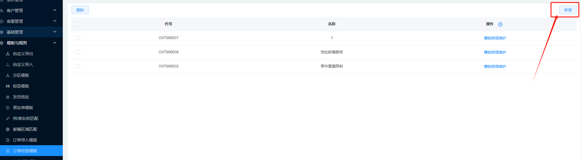 ## 简介:可根据渠道特性要求对预报货品信息、收件信息、包裹信息等自定义设置下单校验限制 1、【模板与规则-订单校验模板】,点击【新增】按钮, 自定义模板名称,点击【确定】后保存改信息,模板可删除   2、点击界面右边【操作-模板明细维护】,进入模板明细维护界面 校验模板包含五个部分:基础信息、包裹明细、收件信息、发件信息、报关信息    ### 2.1基础明细校验 基础明细含有:税金支付方式、货物类别、保险金额、保险币种、COD金额、COD币种、申报币种、客户备注、refNO2、refNO3 **校验含有:** a.字段是否必填; b.重量长度最小值、最大值,不在范围内下单限制  ### 2.2包裹明细校验 包裹明细含有:包裹重量、包裹长宽高、包裹明细围长、包裹公式、 **校验含有:** a.字段是否必填; b.重量长度最小值、最大值,不在范围内下单限制  ### 2.3收件人信息校验 收件信息含有:收件人名称、公司、电话、邮箱、国家代码、省州、城市、区/县、乡/镇、地址、邮编、门牌号、街道、证件号、税号 **校验含有:** a.字段是否必填; b.字符最小、最大长度; c.是否允许含中文; d.黑名单模板,无服务校验; e.正则表达式,正则表达式校验提示,可联系系统方客服提供技术支持  ### 2.4发件人信息明细校验 发件人信息含有:发件人名称、公司、电话、邮箱、国家代码、省州、城市、区/县、详细地址、邮编、门牌号、街道、IOSS增值税类型、IOSS登记号\发件人税号、EORI登记号、VAT税号、VAT注册地址、VAT公司英文名、VAT注册国家 **校验含有:** a.字段是否必填; b.字符最小、最大长度; c.是否允许含中文; d.黑名单模板,无服务校验; e.正则表达式,正则表达式校验提示,可联系系统方客服提供技术支持  ### 2.5报关明细校验 报关信息含有:中文品名、英文品名、数量、单位净重、品牌、货品条码、SKU、海关编码、产品型号、材质、用途、原产地、配货备注、商品URL **校验含有:** a.字段是否必填; b.字符最小、最大长度; c.数量最小值、最大值; d.是否允许含中文; e.黑名单模板,无服务校验; f.正则表达式,正则表达式校验提示,可联系系统方客服提供技术支持
