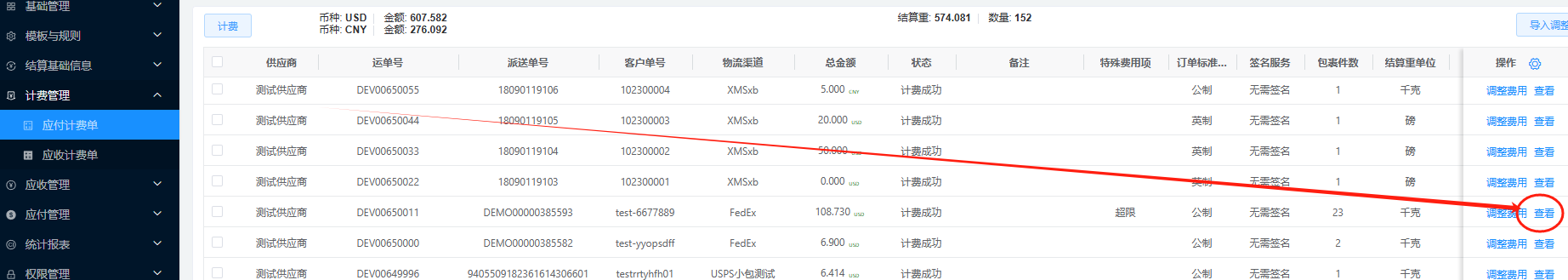 ## 简介:供应商应收计费单据管理,正常预报完成后系统自动生成应付计费单 【计费管理-应付计费单】,按票生成计费单据,可以单独调整费用,可批量重新计费 查询界面如下图:  左边【计费】按钮,可勾选单据重新计费  批量调整费用-点击右边按钮【导入调整】-【覆盖导入】或【差异导入】· **覆盖导入调整**是指覆盖掉原有的金额导入调整,点击【覆盖导入】-下载模板    填写覆盖金额的信息后导入上传  **差异导入调整**是指原有的金额增减金额导入调整,点击【差异导入】-下载模板    填写差异金额的信息后导入上传  【操作-调整费用】,点击后可手动增加费用明细   计费单据字段界面展示栏中 右边点击查看可查询金额明细,计费时间等详情   如果是一票多件货物,可单独调整子单的费用 点击【操作-查看】-【包裹信息】-【调整费用】   如计费无误,请移动到【应付费用管理-应付费用单】审核费用生成应付账单