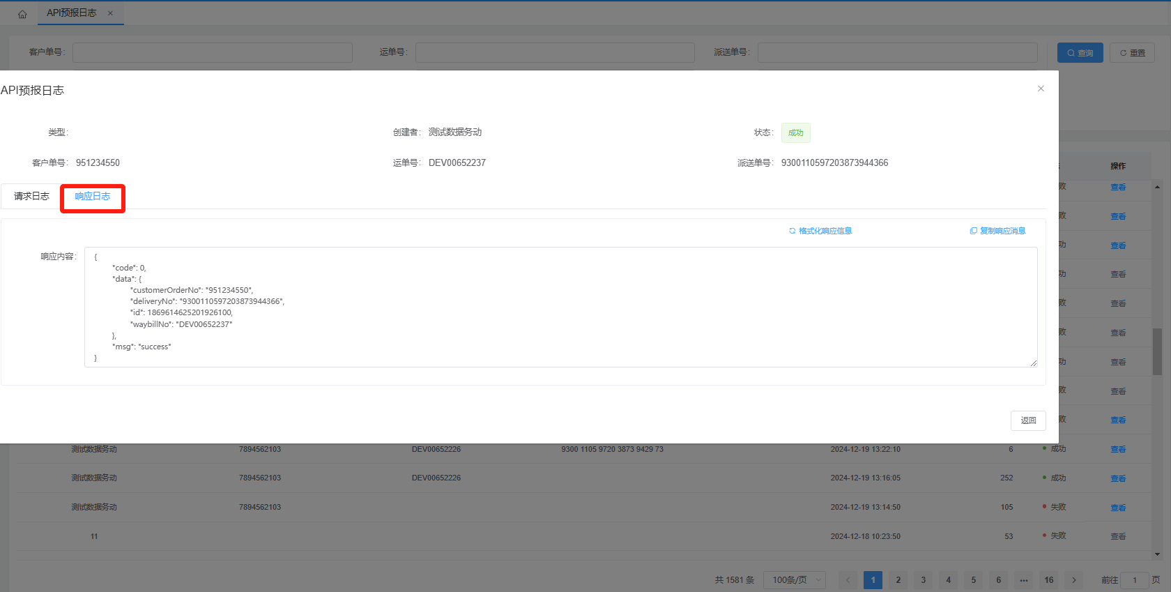 ## 简介:外界API调用本套系统的API接口请求记录查询,包含预报下单、获取面单、取消订单、查询派送单号、轨迹查询等不同接口的请求记录 【日志管理-API预报日】,根据不同的查询条件搜索查询后,按对应的记录点击 【查看】,获取API报文日志,查看外界对本套系统的请求和响应日志