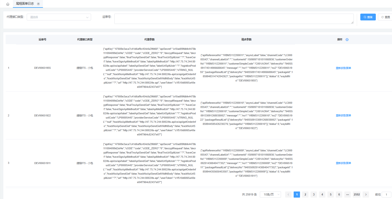 ## 简介:尾程渠道代理系统API面单日志记录查询 【日志管理-尾程面单日志】,根据不同的查询条件搜索查询后,按对应的记录点击 【查看】,获取API面单报文日志